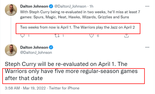 勇士跟队记者Dalton Johnson报道称,库里要在两周后进行伤势评估,意味着他将缺席至少7场比赛,对手是马刺、魔术、热火、老鹰、奇才、灰熊和太阳。他有望在两周后的4月2日(北京时间)进行重新评估,而勇士将在4月3日对阵爵士。换言之,库里最快能在4月3日复出,最多还能打5场常规赛。