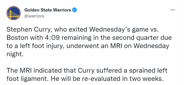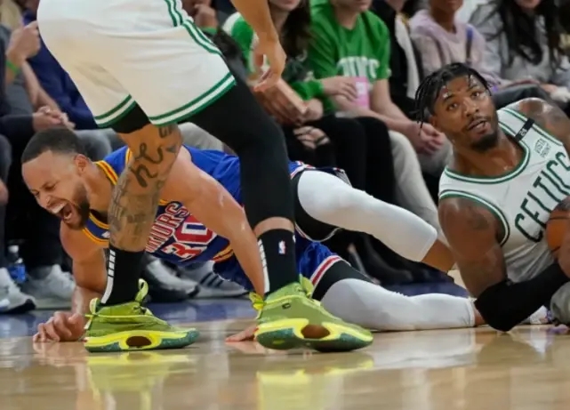 库里在勇士对凯尔特人的比赛第二节受伤,当时他和斯马特拼抢一个地板球,结果脚被压伤。库里在当天晚上接受核磁共振检查,显示左脚韧带扭伤。