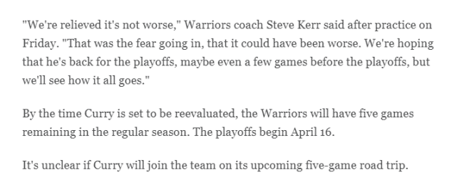 科尔谈到库里在养伤期间的安排。“他将恢复体能和活力,在这段时间休息里重新充电……所以,积极的一面是他将在季后赛到来前得到休整……就球队来说,这将给他们(库里的队友)一个学习如何在没有他的情况下打球的机会。这会在季后赛里他不在场的几分钟里派上用场,我们现在能够执行得越好,对我们未来就越有帮助。”