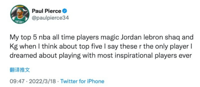 JRS直播03月18日讯 ,前NBA球星保罗-皮尔斯更新社媒,谈到了历史前五球星的话题。皮尔斯写道:“我心目中的历史前五是魔术师约翰逊、乔丹、詹姆斯、奥尼尔、加内特。当我想到历史前五时,我会说他们是我唯独想要一起打球的球员,他们是有史以来最具影响力的球员。”