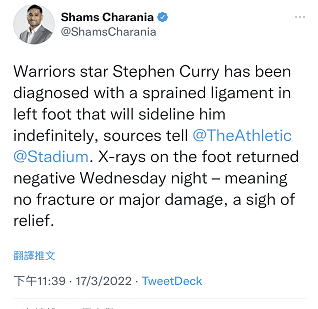 JRS直播03月18日讯 受伤的库里传来最新的消息,这是根据Shams的报道显示,库里左脚韧带扭伤,无限期缺阵,不过昨晚的X光检查确认没有骨折或任何重大损伤。
