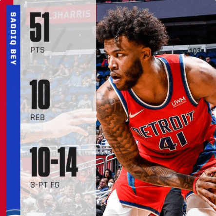 JRS直播03月18日讯 ,NBA只有一场比赛,但却诞生了赛季的又一场得分50+之战!活塞球员萨迪克·贝全场26中17,其中三分球14中10,轰下了疯狂51分10板!这也是本赛季第17次出现单场50+的得分,而萨迪克贝是其中非常年轻的一位。这场比赛,萨迪克贝也创造了多项个人纪录以及活塞球队的纪录。