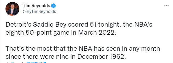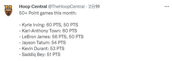 在三月份已经有6名球员单场50+,詹姆斯、杜兰特、欧文、塔图姆、唐斯和萨迪克-贝。