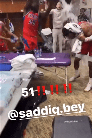 赛后活塞全队在更衣室疯狂泼水庆祝,萨迪克-贝被队友浇水,浑身湿透,里程碑之夜尽情狂欢。