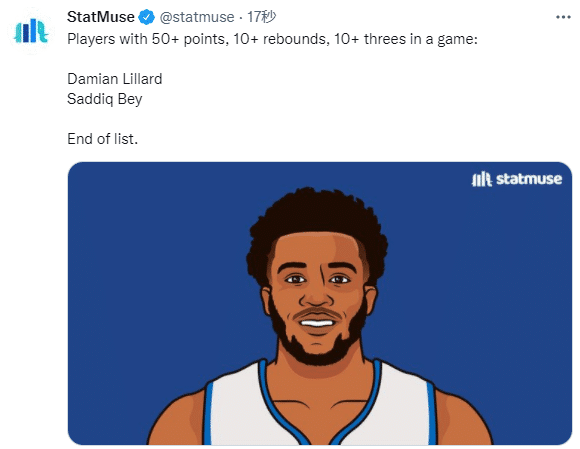 萨迪克-贝成为本赛季第13位单场50+的球员,此前塔图姆(51分、54分),杜兰特(51分、53分),詹姆斯(56分、50分),欧文(50分、60分),库里(50分)、特雷-杨(56分)、杰伦-布朗(50分)、恩比德(50分)、东契奇(51分)、字母哥(50分)、莫兰特(52分)和唐斯。