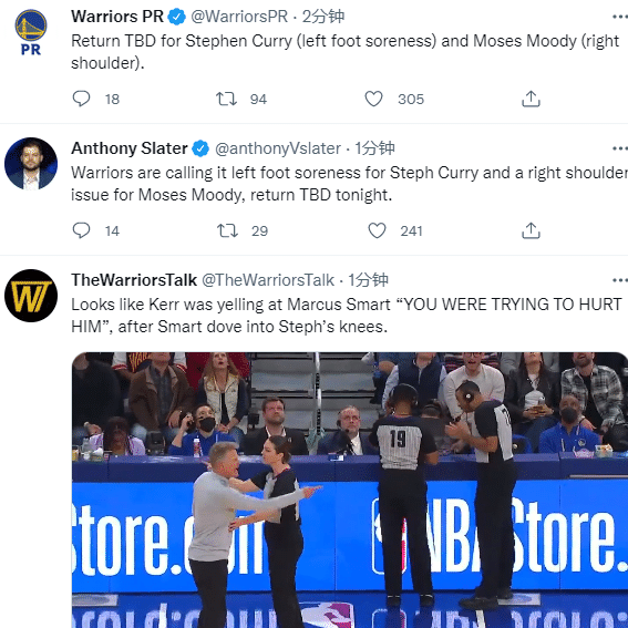 勇士官方宣布库里左脚酸痛和穆迪右肩受伤,是否回归待定。