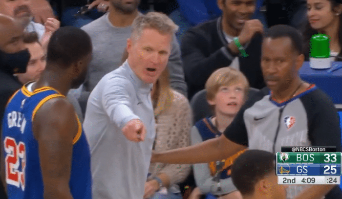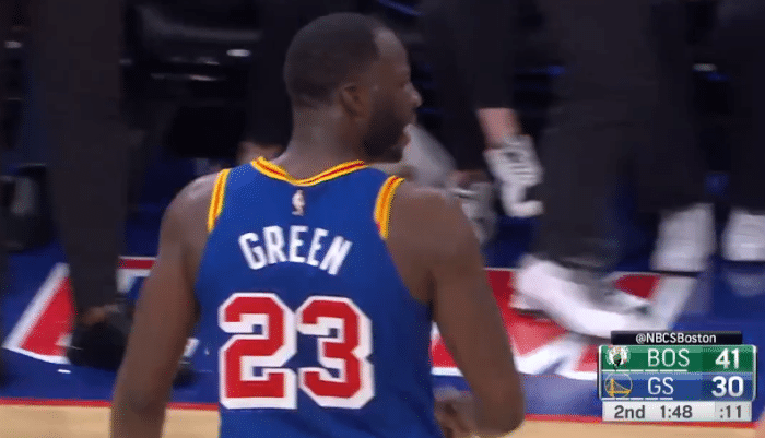 库里受伤离场后,场上发生恶意犯规事件,格林因不满裁判又吃到技术犯规。