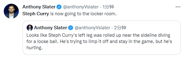 离场前库里上场13分钟4投1中拿到3分2助攻1篮板以及4失误,从现场画面来看,在一次无球争夺时,库里被斯玛特压伤脚踝,库里在场边一瘸一拐,之后被换下,然后返回更衣室接受检查,值得一提的是,库里是一路跑回更衣室,但愿他的伤势无大碍。