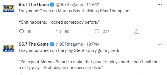 赛后谈到库里受伤,追梦格林表示:“我希望马库斯-斯玛特在球场上打得很努力,我不能说今晚的比赛很肮脏,但他的那个飞扑动作可能是没有必要的。