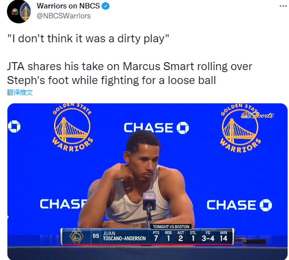 JRS直播03月17日讯 ,勇士主场不敌凯尔特人,第二节场上发生意外实践,库里左脚踝被斯玛特压伤,仅打13分钟就因伤提前退出比赛,赛后科尔直言斯玛特的动作太危险,而斯玛特本人则表示他不会故意伤人。