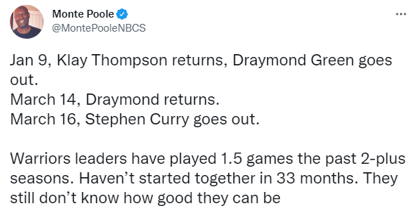 赛后库里接受了核磁共振检查,希望库里的伤势无大碍;最近两个多赛季,勇士队伤病频发,汤普森因伤连续两个赛季报销;汤普森复出后格林受伤,格林复出后库里又伤了,勇士三巨头1006天仅仅在一起打过一场完整比赛。
