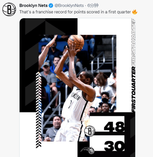 NBA常规赛篮网做客对阵魔术。结果,杜兰特和欧文双双出战的篮网,单节比赛狂轰48分,直接创下队史55年首节得分纪录!欧文和杜兰特火力全开,两人单节合砍26分!首节结束,篮网便以48-30领先18分。一场大胜,似乎近在眼前。