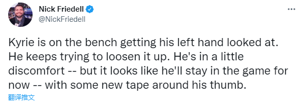 据前方记者Nick Friedell报道,欧文坐在替补席休息时接受拇指伤势的治疗,重新绑上新的绑带,不过欧文伤势无大碍,第二节继续带队出战。