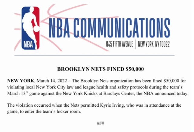 JRS直播03月15日讯 ,NBA官方宣布,篮网违反了纽约当地和联盟的健康安全条例,被罚款5万美元。具体原因竟然是在纽约德比一战的中场休息时,他们允许欧文进入球队更衣室,而欧文在那一天本该只有场边观战的资格。