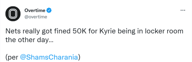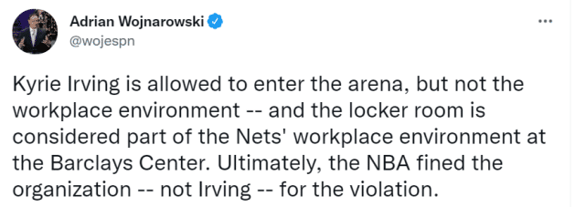 美媒转发了这一消息后,感慨道:欧文只是换一天进了篮网更衣室,他就被罚了。显然也是暗示这个防疫规定实在太离谱。毕竟,欧文平时都被允许在篮网主场训练,当然也没少进球队更衣室,只是换到比赛当天走进去,就被罚款了。