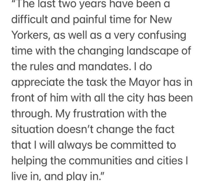 杜兰特的言论遭到名记Michael Wilbon的抨击,认为他应该指责欧文不打疫苗,而不是市长的规定。而今天,杜兰特又在声明中感谢了纽约市长。他在声明中写道:“过去两年对纽约人来说是一段艰难而痛苦的时光,也是一段对不断变化的防疫规定和命令感到非常困惑的时光。我很感激纽约市长为了这座城市而所做出的努力,以及带领这座城市所经历的一切。我对现状的失望并不能改变一个事实,那就是我将永远致力于帮助我所生活及效力的社区和城市。”