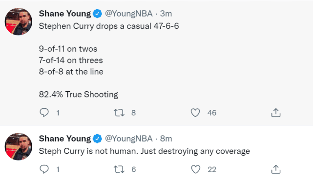 美媒调侃:波普不让库里生日拿50分。名记肖恩-杨点评:“47分6篮板6助攻,两分11中9,三分14中7,罚球8中8 ,真实命中率82.4%,他不是人类,摧毁任何防守。”