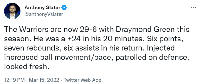 勇士记者斯雷特点评了格林的作用。“格林上场,勇士29胜6负,本场他打了20分钟,正负值+24,他得到6分7篮板6助攻,提升了球的转移,也增强了防守,看上去活力十足。”