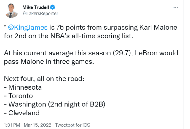 JRS直播03月15日讯 ,湖人103-114不敌猛龙,詹姆斯得到30分。赛后,湖人记者报道称,詹姆斯距离超越卡尔-马龙只差75分了。詹姆斯目前场均29.7分,以这样的速度,有望在三场比赛左右完成超越。湖人接下来的4场比赛都在客场,对手依次是森林狼、猛龙、奇才和骑士。詹姆斯目前生涯总得分36854分,马龙是36928分。