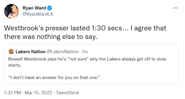 湖人官方宣布,詹姆斯赛后不会接受采访,而威少倒是接受了采访,但他的采访总时长只有90秒。记者问他为什么湖人总是很慢进入比赛状态,威少说:“这个问题我没有答案。”记者Ward表示,威少的采访时间总共90秒,因为大家实在没啥可说的。