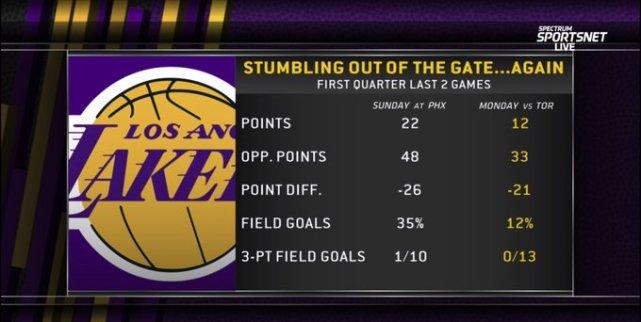 对太阳一战,湖人首节只得到22分,对手48分,输了26分,湖人这节投篮命中率35%,三分10投1中;对猛龙一战,湖人首节只得到12分,对手33分,输了21分,湖人这节投篮命中率更离谱,只有12%,三分球13投0中。