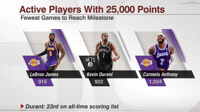 首先,美媒公布了现役3人解锁25000分里程碑所用的场数,詹姆斯用了915场,杜兰特用了922场,安东尼用了1024场,论得分能力,杜兰特和安东尼的名声都盖过老詹,但实际上詹姆斯是三人中最快解锁25000分的。赛后,杜兰特在接受采访时这一里程碑,他说:“这很酷,但说实话,我本来应该已经拿了30000分。”