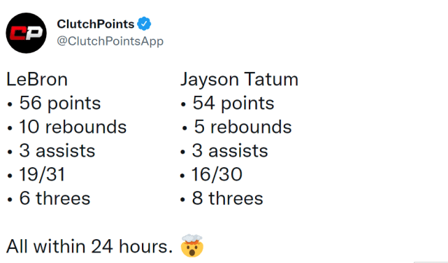 提到50+的分数,塔图姆今天轰下54分,刷爆了纪录,而美媒也很快晒出了塔图姆儿时与詹姆斯的合影,并配文写道:“过去两位单场得到50+分数的球员!”