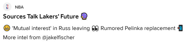 Jake Fischer透露,湖人和威少分手有两种方案,