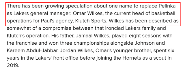 虽然湖人仍然重视与佩林卡的关系,而且佩林卡得到不少支持,但魔术师、兰比斯夫妇在湖人决策中有重要话语权。消息人士透露,佩林卡和兰比斯夫妇的关系,就像“家族成员经营的小型零售店”。越来越多人猜测,詹姆斯的经纪公司Klutch体育的篮球运营负责人奥马尔-威尔克斯可能是接替佩林卡职位的潜在候选人。