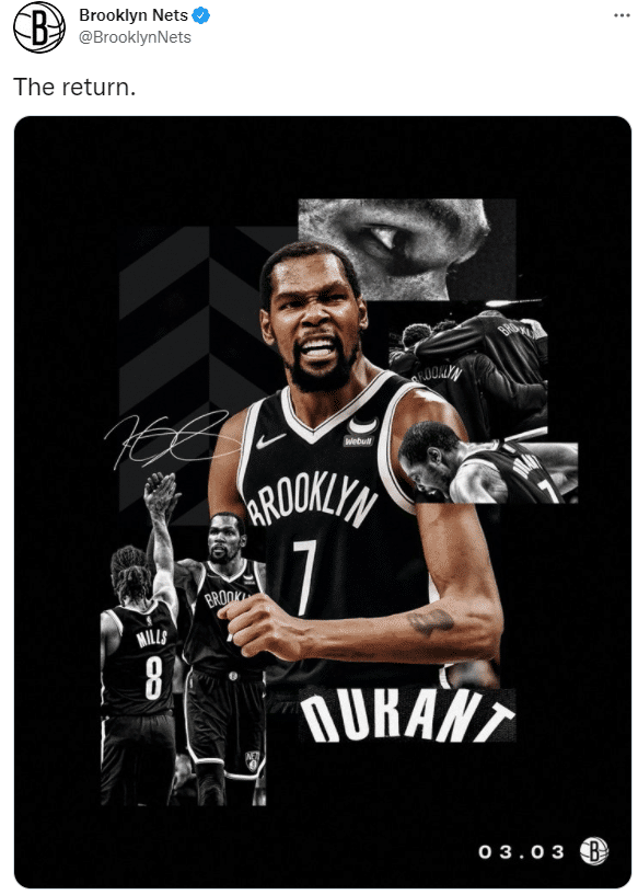篮网官方正式宣布,官推晒照并且配文:杜兰特3月4日正式复出;杜兰特将在明天对阵热火的比赛中复出;赛季至今,杜兰特因伤缺席27场比赛,期间篮网仅8胜19负,因左膝副韧带拉伤连续休战21场,本赛季已出战36场,场均29.3分7.4篮板5.8助攻,期间篮网24胜12负。