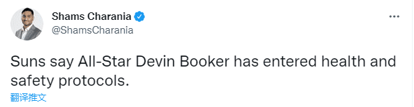 太阳官方表示德文-布克触发健康安全协议,预计将缺席数场比赛;太阳又遭打击,此前保罗因拇指撕脱性骨折,基本常规赛报销,现在布克被隔离将缺席数场比赛,太阳双星都无法出战;到目前为止,太阳49胜12负排名联盟第一,领先西部第二的勇士6.5个胜场。