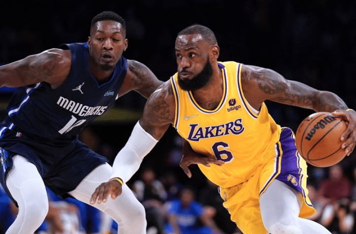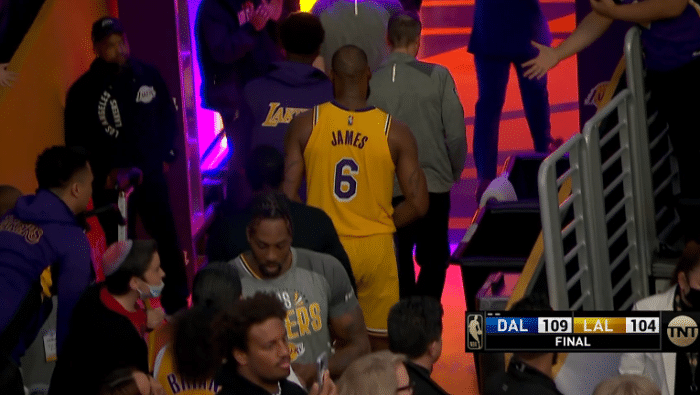 下半场,湖人第三节疯狂反扑,开场13-1追到仅落后3分,独行侠回应三分,之后詹姆斯外线开炮,三分越投越远,logo超远三分点燃球馆,连续3记三分让湖人女老板珍妮-巴斯乐开怀;下场休息时,詹姆斯累的直接累瘫倒,躺进替补席。