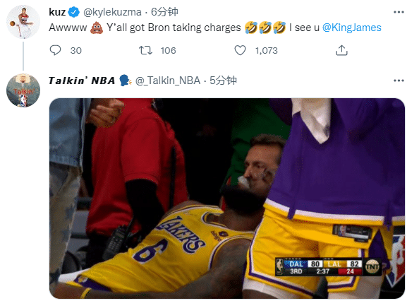 看到詹姆斯累瘫倒进替补席一幕,库兹马发推写到:啊哦,勒布朗(詹姆斯)正在接管比赛,我看见你了。