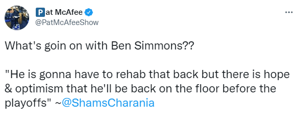 JRS直播03月01日讯 篮网新巨头西蒙斯何时能够复出?shams表示西蒙斯将会养伤,但乐观的是他将在季后赛前重返赛场。