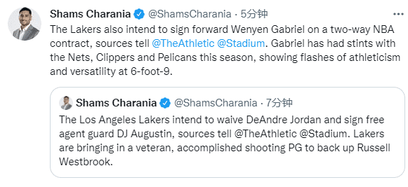 JRS直播03月01日讯 ,据Shams随后补充报道,湖人还计划与韦尼恩-加布里埃尔签下一份双向合同,湖人裁掉敦布亚和梅森-琼斯;加布里埃尔共出战7场常规赛,场均贡献2.3分2.3篮板。