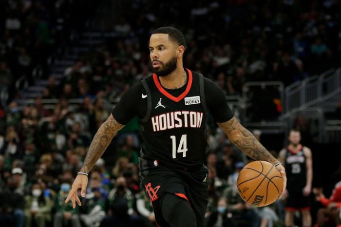 DJ-奥古斯丁在被火箭裁掉前出战34场常规赛,场均贡献5.4分1.2篮板2.2助攻
