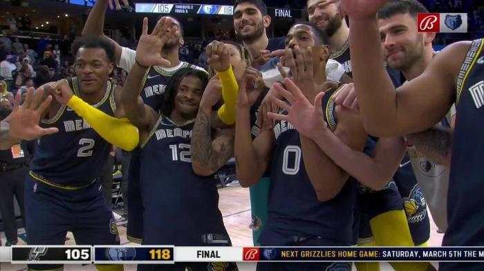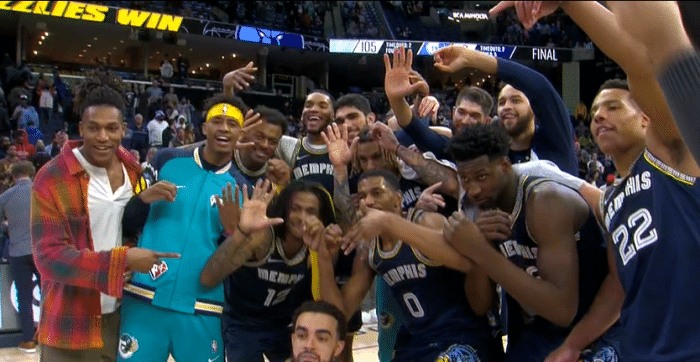 赛后,灰熊全队不仅围着莫兰特疯狂跳舞庆祝,而且全队合影留念,莫兰特等球员都比出50+的手势,集体为莫兰特生涯之夜而庆祝。