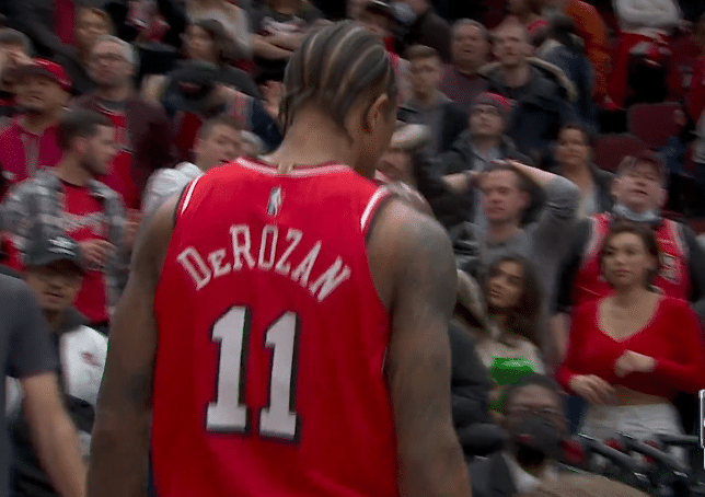 第四节,灰熊突然哑火,德罗赞连续单挑莫兰特并中投得分,再加上造犯规,阿赞带队打出14-0攻势追平比分,卡鲁索疯狂握拳怒吼庆祝;随后莫兰特得分止血,关键时刻带队稳住局面,生死时刻,德罗赞致命失误,抱怨裁判又吃T,累计两T被驱逐离场,最终灰熊116-110惊险拿下胜利,终结公牛6连胜。