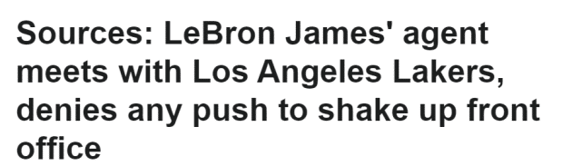 据ESPN记者沃纳罗斯基报道,勒布朗-詹姆斯的经纪人里奇-保罗(富保罗)已经在当地时间本周二(北京时间本周三)与湖人老板珍妮-巴斯以及总经理罗勃-佩林卡完成会面。消息人士透露,富保罗表示,他们没有寻求管理层的变动,他认为球队令人失望的表现是大家共同的责任。