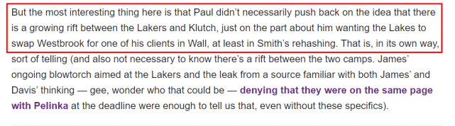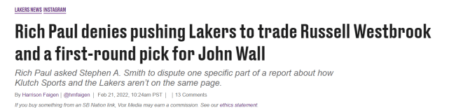 美媒在转发史密斯的这番话时,也提出了一些疑问。比如,里奇-保罗并没有否认自己和湖人之间的分歧越来越大,而只是单独否认了威少换沃尔这部分的内容。