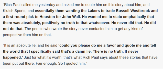 斯蒂芬-A-史密斯在节目上说道:“里奇-保罗昨天打电话给我,让我在节目中转述他的话。关于他们希望湖人用威少+首轮去换沃尔的报道不是事实,他希望我强调说这是绝对没有发生的事,他从来没有那么做,写这篇报道的人也从来没有联系过他,没有从他那里得到任何消息。”