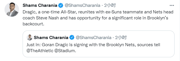 德拉季奇已经做出决定,据名记shams报道,自由球员德拉季奇将会加盟篮网,曾入选全明星的德拉季奇与前太阳队球星现任篮网主教练的史蒂夫-纳什重聚,,德拉季奇和篮网签约至赛季结束,他有机会在篮网的后场发挥重要作用。