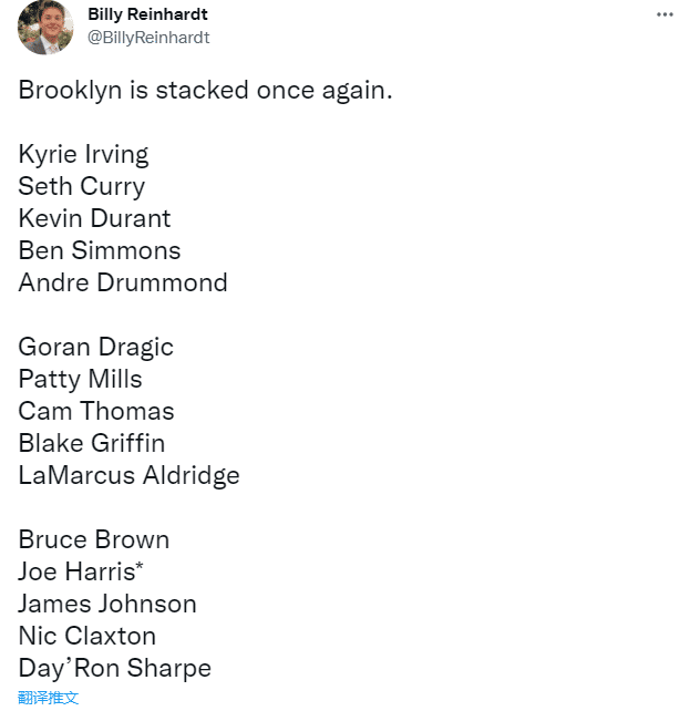 JRS直播02月22日讯 ,篮网记者晒出篮网队全新的15人大名单——杜兰特、欧文、西蒙斯、赛斯-库里、德拉蒙德、德拉季奇、米尔斯、托马斯、格里芬、阿德、小布朗、乔-哈里斯、詹姆斯-约翰逊、克拉克斯顿和夏普;目前篮网31胜28负排名东部第八。