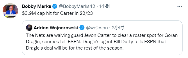本赛季篮网将会因为裁掉杰文-卡特出现365万美元的死钱,下赛季将会出现392.5万美元的死钱(死钱指的是买断或者裁掉球员后必须支付、无法交易的部分)