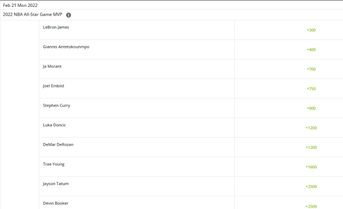詹姆斯(+300)、字母哥(+400)、莫兰特(+700)、恩比德(+750)、库里(+900)、东契奇(+1200)、德罗赞(+1200)、杨(+1600)、塔图姆(+2500)、布克(+2500)、约基奇(+3000)、米切尔(+3300)、唐斯(+3300)、保罗(+4000)、加兰(+5000)、巴特勒(+6600)、拉文(+6600)、维金斯(+8000)、穆雷(+8000)、范弗利特(+10000)、阿伦(+10000)、米德尔顿(+12500)、戈贝尔(+15000)