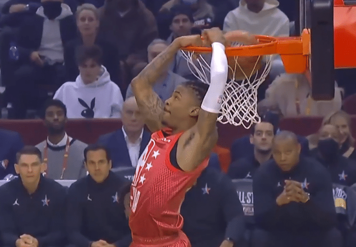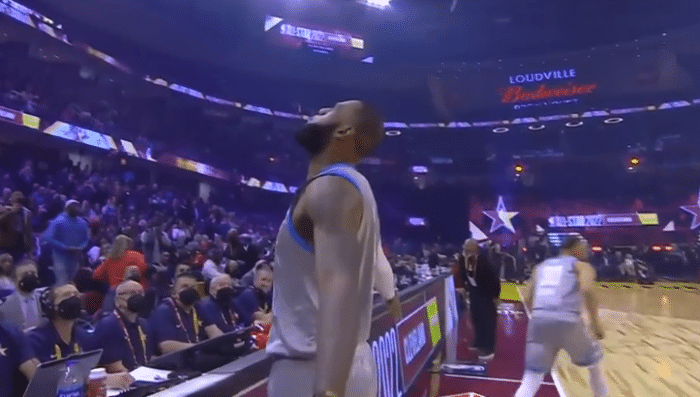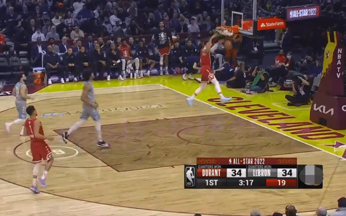 比赛开始后,詹姆斯撒镁粉,一旁的库里立马跑开了,比赛开始后,字母一记暴扣命中本场比赛第1球,库里三分命中,特雷杨三分回应,塔图姆暴扣得手,詹姆斯反篮得手,约基奇三分命中,恩比德扣篮,詹姆斯暴扣回应,詹姆斯队凭借着火热的手感取得了比分上的领先,莫兰特接吹杨传球完成平筐空接背扣点燃全场,有球迷说道:这扣篮放昨天夺冠了。库里先后盖掉了维金斯和塔图姆的上篮,这也是库里的生涯单场盖帽纪录。詹姆斯命中一记三分,这也是他全明星赛命中的第39记三分,追平哈登并列历史第一。