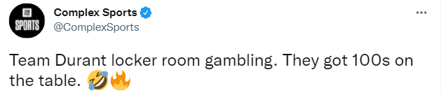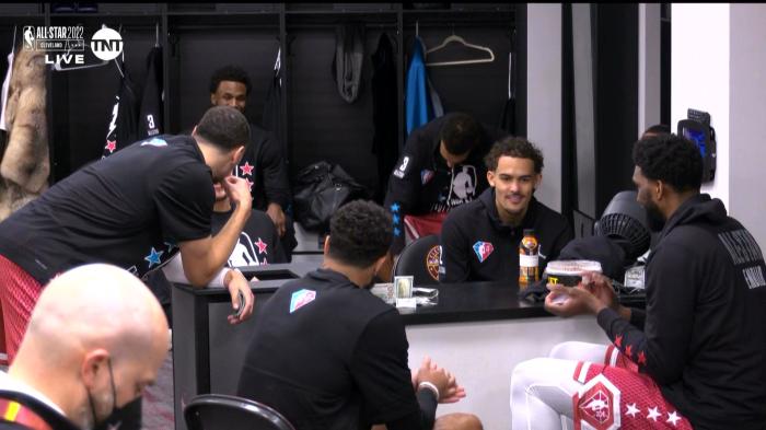 全明星正赛开打之前,杜兰特队的心态很轻松,无聊到打牌赌博来消磨时光,美媒对此感到很惊讶,露天看台发推写道:他们真的在全明星赛之前在更衣室赌博。