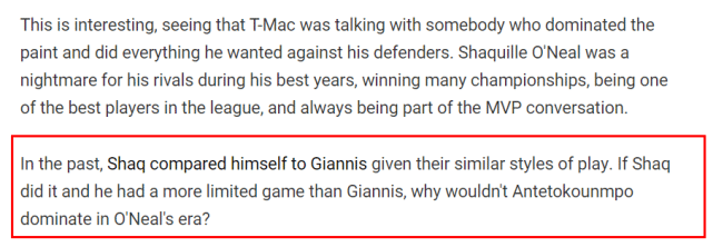 FW并不同意麦迪的观点,并拿字母哥和奥尼尔进行对比,写道:“奥尼尔在那个时代是对手的噩梦,赢得不少冠军,成为联盟里最好的球员之一,而且常常被列入MVP的讨论范围。奥尼尔曾经说过字母哥的打法和自己很相似。如果奥尼尔可以称霸那个时代,他的进攻范围比字母哥更小,那么字母哥为什么会在那个时代就不管用?”