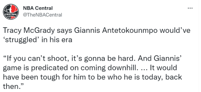 谈及字母哥在自己的那个年代打球会有怎样的表现时,麦迪说:“我认为他会打得很挣扎,因为那时候的禁区太拥挤了。他的进攻会很艰难,因为那时候的防守太好了。”麦迪还说:“在那个年代打球,如果你不会投篮,那就会很艰难。字母哥的进攻是建立在持球攻筐的基础上,如果在我那个时代,他很难成为现在的自己。”