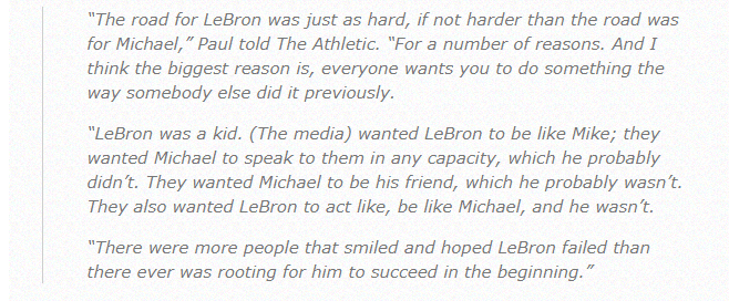 “当勒布朗还是个孩子时,(媒体)就希望他和乔丹一样。他们希望乔丹能在任何场合谈谈勒布朗,但他可能没有那么做。他们还想让乔丹成为勒布朗的朋友,但他可能也不是。他们更希望勒布朗能和乔丹一样,但他没那么做。”